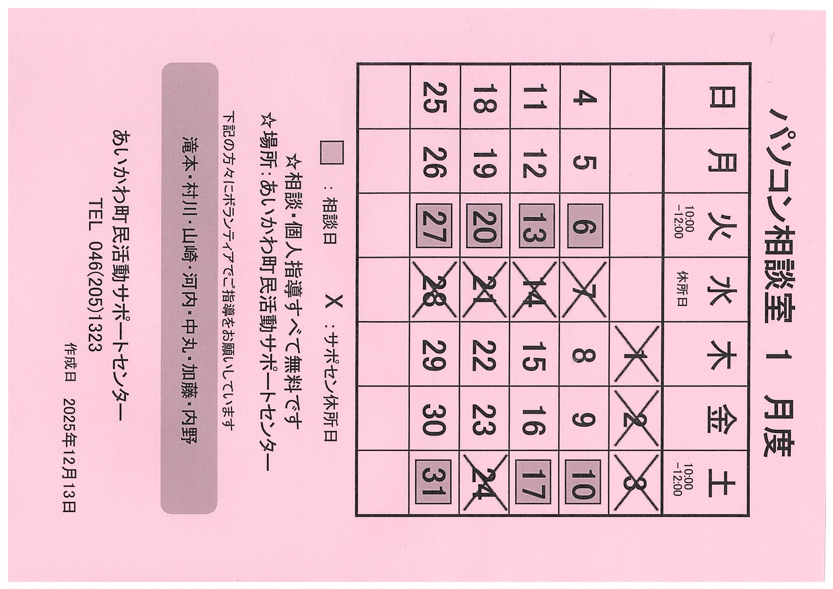 あいかわ町民活動サポートセンターでは、パソコン初心者のための「パソコン相談室」を開催しています。 パソコンの立ち上げからワード、エクセルなどのオフィスソフトで皆さまが困っていることについて、毎週火曜日と土曜日にサポートセンターのボランティアが相談にのっております。 相談は全て無料ですので、町民の皆さまのご利用をお待ちしております。