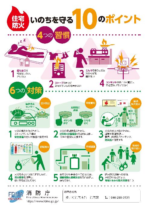 - 火災の早期発見のために、住宅用火災警報器を定期的に点検し、10年を目安に交換する