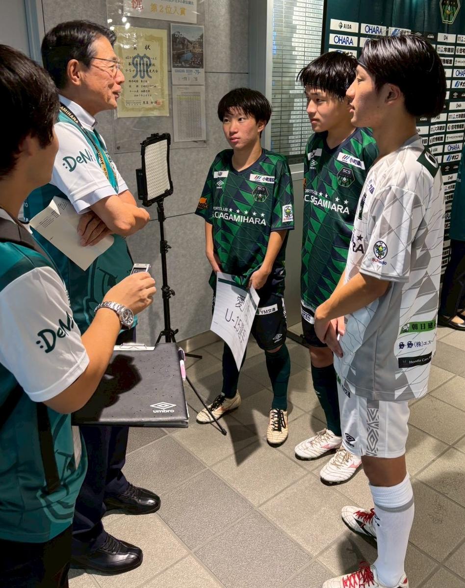 佐藤教育長と歓談する愛川町から参加した選手たち(左から田所選手、小林選手、比江島選手) 愛川町からの出場選手の紹介比江島 小太朗選手 愛川中学校3年生小林 祐晴選手 愛川東中学校3年生田所 優斗選手 愛川東中学校3年生出場した選手へ試合前後のインタビュー比江島 小太朗選手試合に向けての意気込み「今日は会場にいる観客を沸かせたいと思います!」 注目して欲しいプレー「自分のシュートでゴールを決めるところを観てほしいです!」 試合を振り返って「大きい舞台で、初めは緊張していましたが、ドリブルをしたら楽しくなってきて、 そこからはドリブルが多くできました!」 自分の中で上手くできたプレー「右サイドからドリブルで突破してパスをしたプレーです!」 小林 祐晴選手試合に向けての意気込み「実力がある選手ばかりだと思うのですが、くらいついて得点をとれるように頑張ります!」 注目して欲しいプレー「体を使ったプレーを観てほしいです!」 試合を振り返って「初めは思うようなプレーができませんでしたが、プレーをしていくうちに緊張がほぐれ、ヘディングシュートも打てたので良かったです。」 自分の中で上手くできたプレー「自分の課題にしていたヘディングでシュートを打てたプレーです!」 田所 優斗選手試合に向けての意気込み「自分の全力を出せるように頑張ります!」 注目して欲しいプレー「裏に抜けるプレーやディフェンスを観てほしい!」 試合を振り返って「試合に出てボールに触っていくうちに、緊張がほぐれてきて、最後は楽しんでプレーができました!」 自分の中で上手くできたプレー 「相手の裏に走り込んでパスを受けることができたプレーです!」