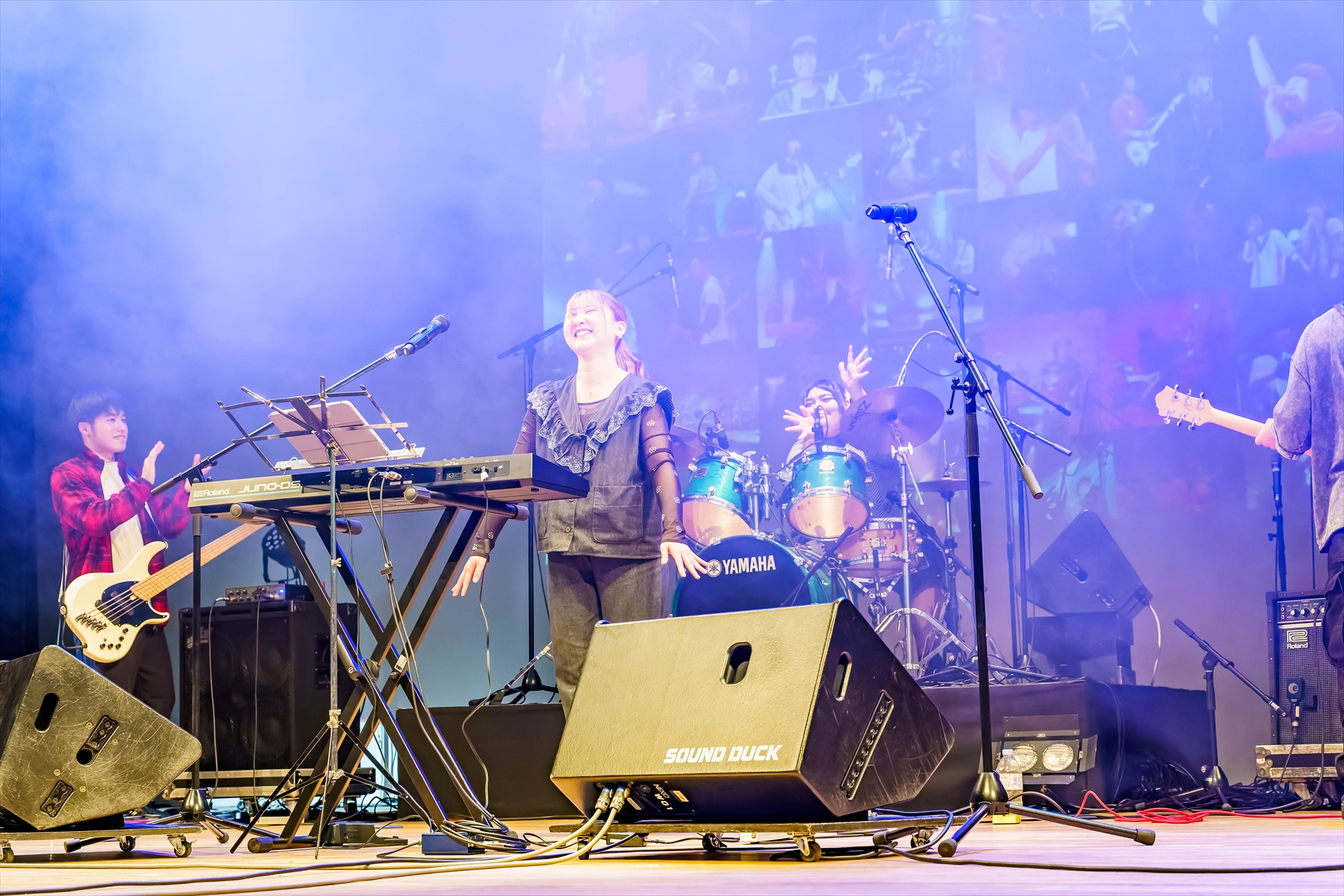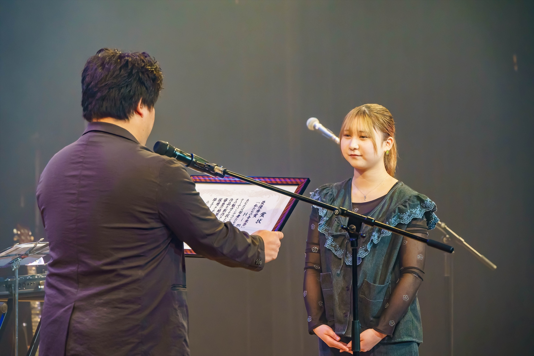 オープニングに先立ち、テーマソングコンテストで最優秀賞に選ばれた「私たちの音楽祭」を作詞・作曲していただいたシンガーソングライターの「Hima」さんに米村委員長から表彰状と記念品が授与されました。 【10:35~】オープニングテーマソング演奏(すこちゃんずっ!、Hima、米村委員長)