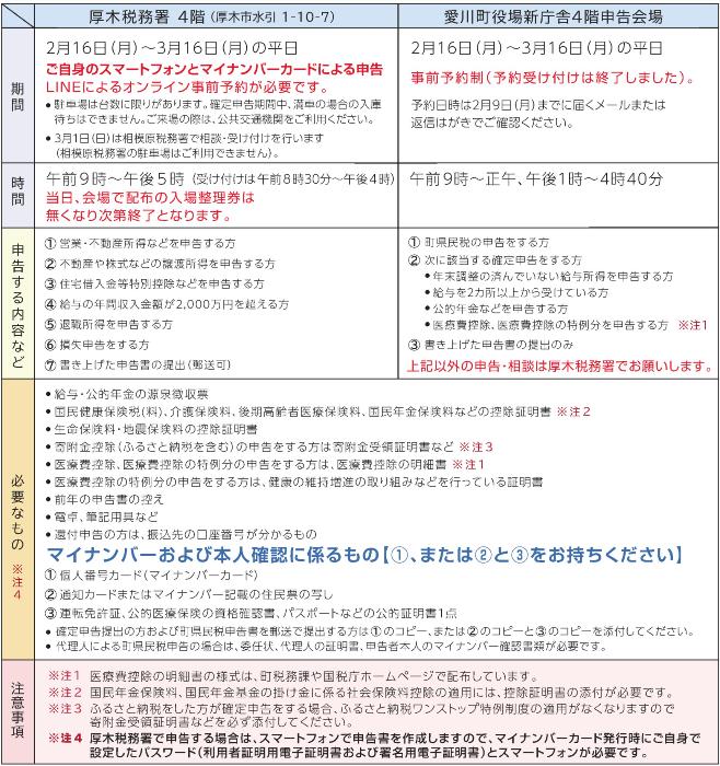 厚木税務署では、所得税などの申告書作成会場を次のとおり開設します。スマートフォンで申告書を作成しますので、スマートフォン、マイナンバーカード発行時に設定したパスワードが必要です。