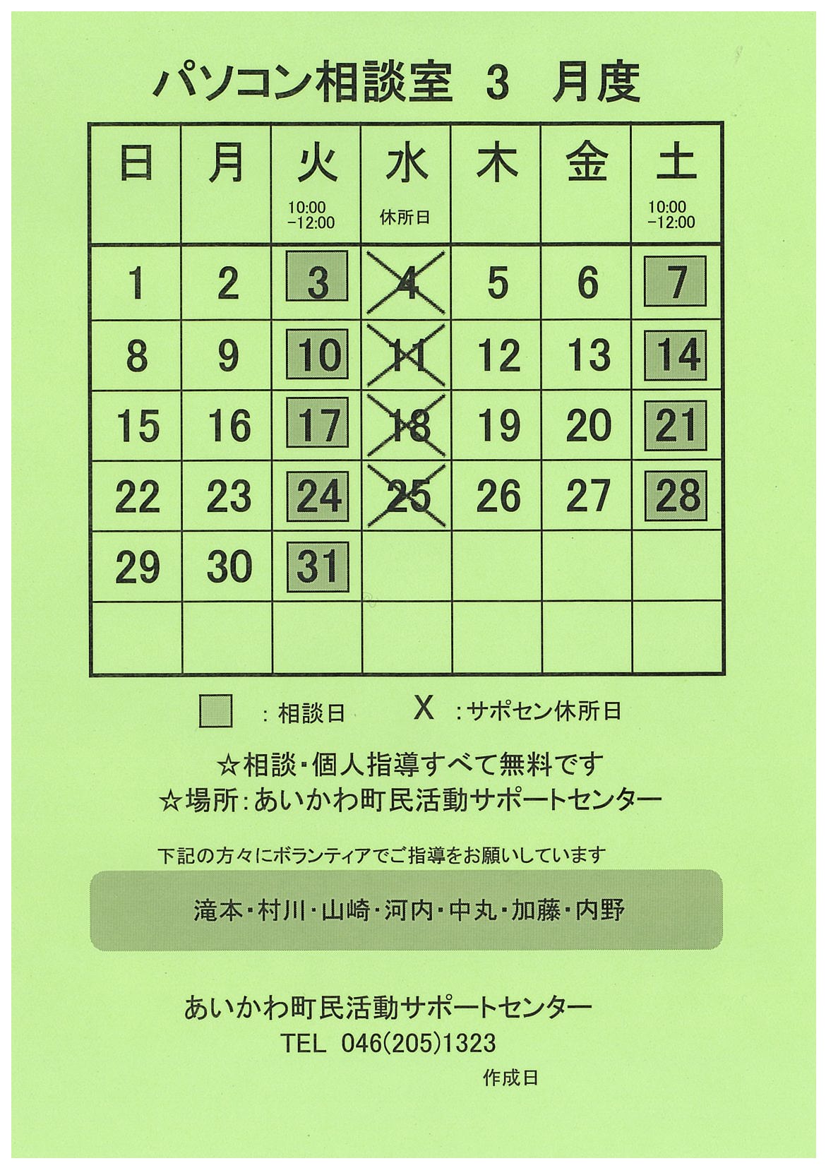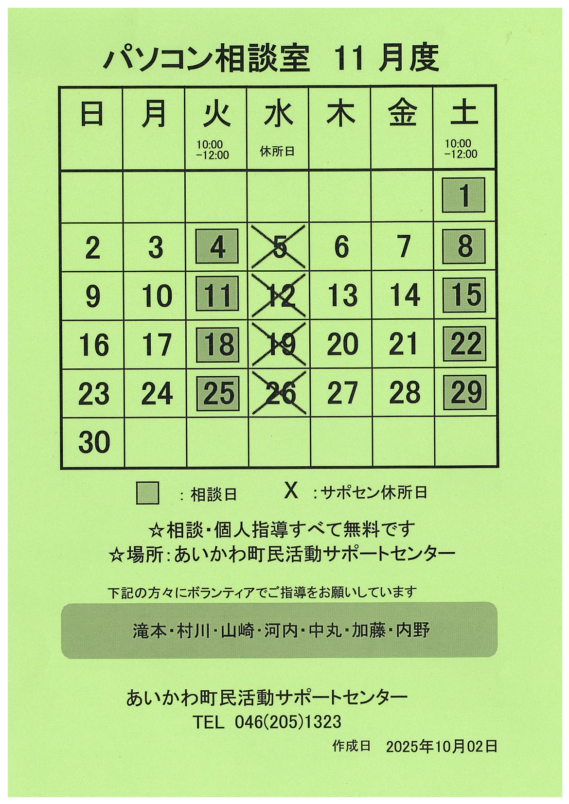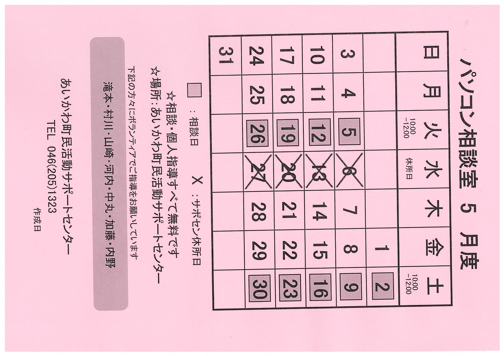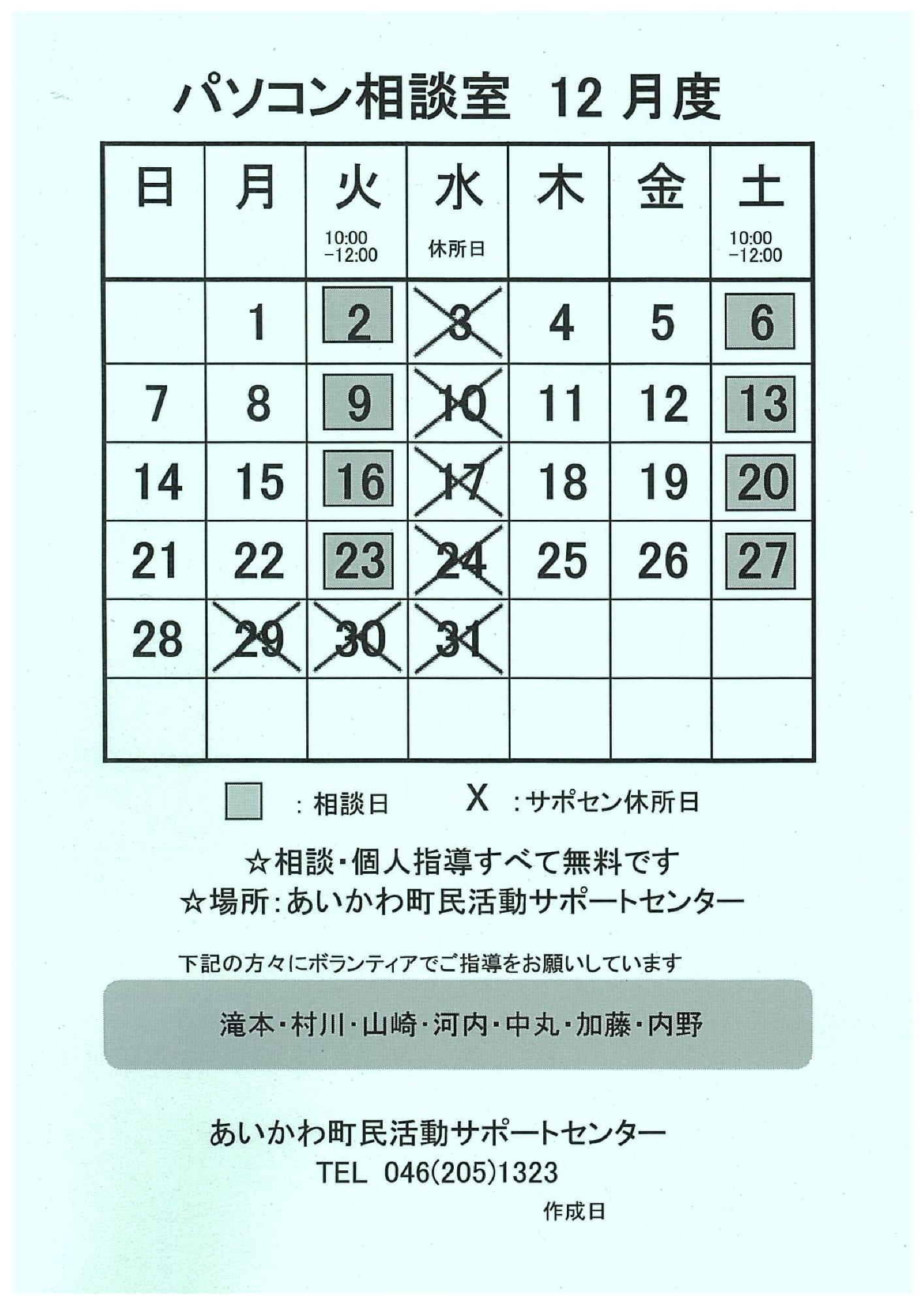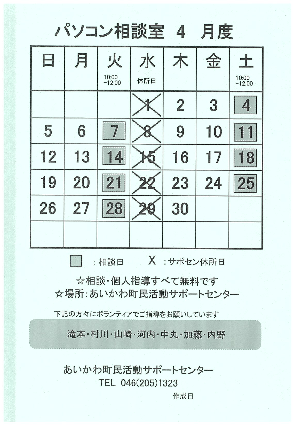 あいかわ町民活動サポートセンターでは、パソコン初心者のための「パソコン相談室」を開催しています。 パソコンの立ち上げからワード、エクセルなどのオフィスソフトで皆さまが困っていることについて、毎週火曜日と土曜日にサポートセンターのボランティアが相談にのっております。 相談は全て無料ですので、町民の皆さまのご利用をお待ちしております。
