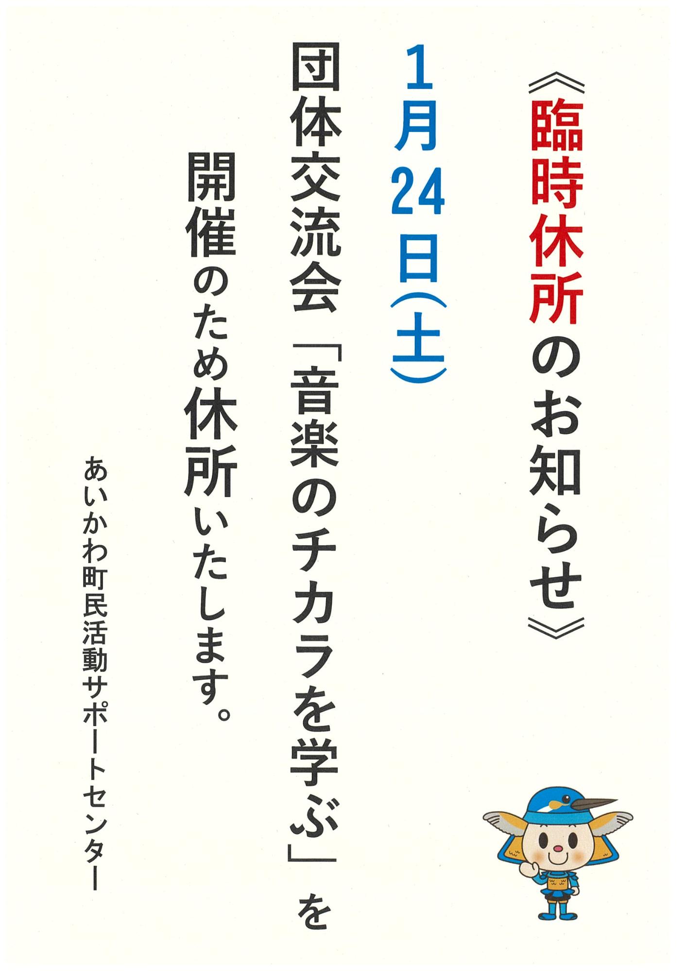 サポセン臨時休所 1月24日(土曜日)臨時休所のお知らせ 1月24日(土曜日)は団体交流会のため、あいかわ町民活動サポートセンターは臨時休所とさせていただきます。 ご迷惑をおかけいたしますが、よろしくお願い申し上げます。 1月24日(土曜日)臨時休所のお知らせ (PDFファイル: 168.0KB)