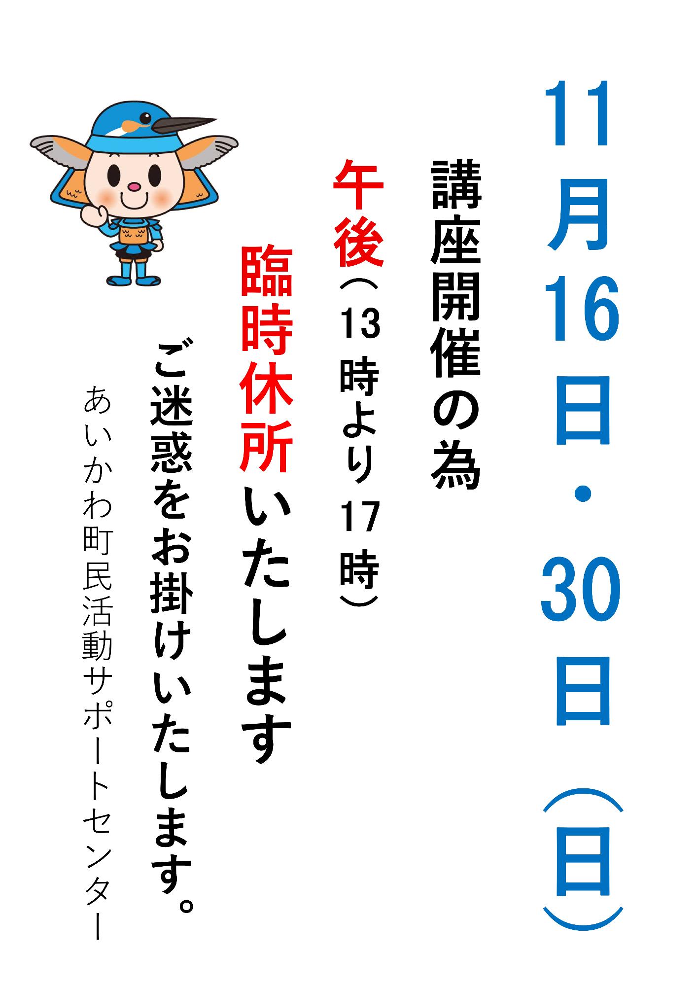 サポセン臨時休所 11月16日(日曜日)、30日(日曜日)午後13時から臨時休所のお知らせ 11月16日(日曜日)、30日(日曜日)は講座開催のため、あいかわ町民活動サポートセンターは、午後13時から臨時休所とさせていただきます。 ご迷惑をおかけいたしますが、よろしくお願い申し上げます。 11月16日(日曜日)、30日(日曜日)臨時休所のお知らせ (PDFファイル: 118.7KB)