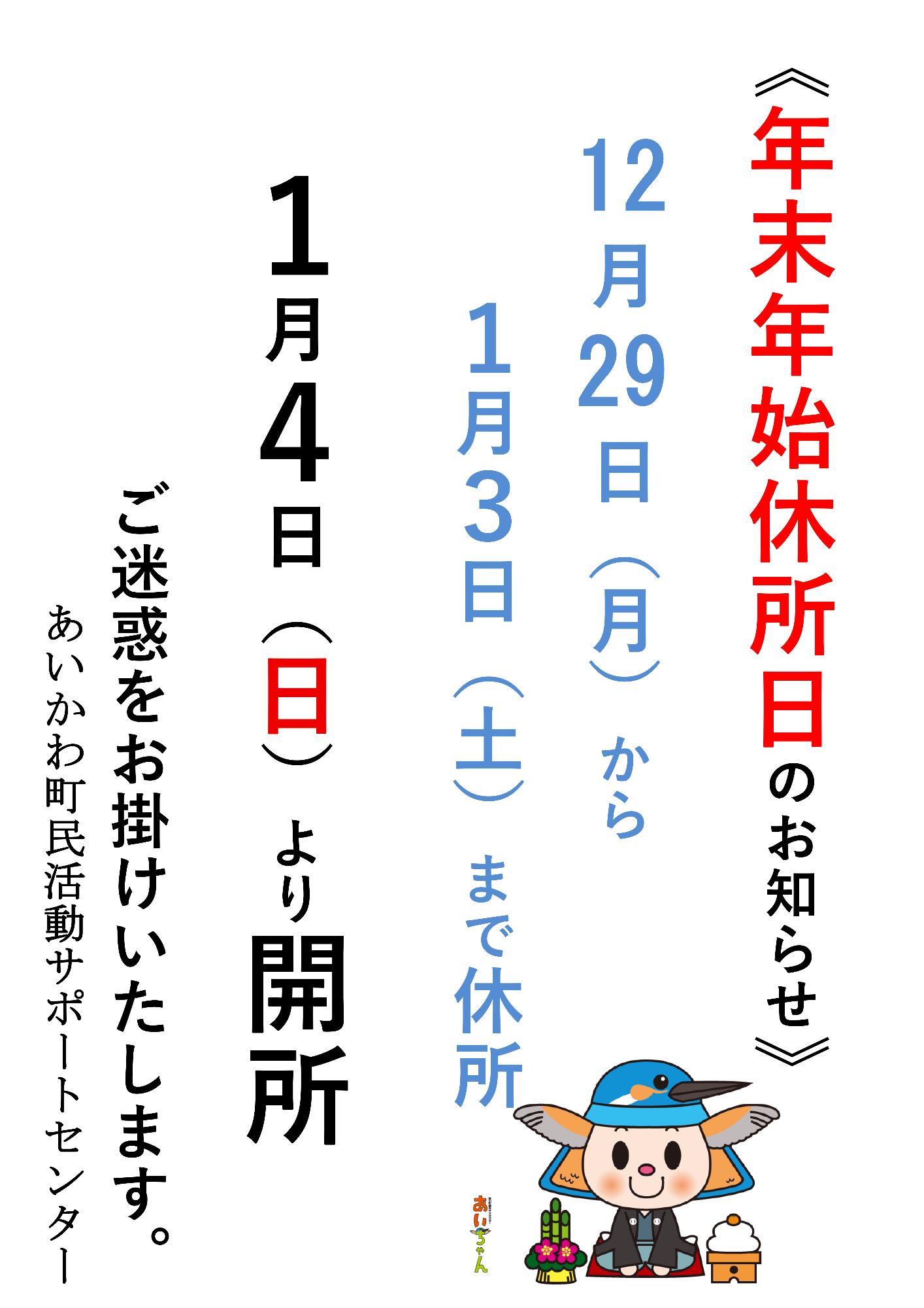 サポセン年末年始休所日 令和7年12月29日(月曜日)から令和8年1月3日(土曜日)まで、あいかわ町民活動サポートセンターは休所となります。 開所は令和7年1月4日(日曜日)からとなりますので、ご迷惑をお掛けいたしますが、ご理解いただきますようお願いします。 サポセン年末年始休所のお知らせ (PDFファイル: 168.6KB)