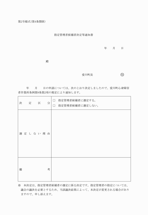 2 指定管理者の指定のために必要な行為は、この規則の施行前においても、改正後の愛川町立心身障害者作業所条例施行規則の例により行うことができる。