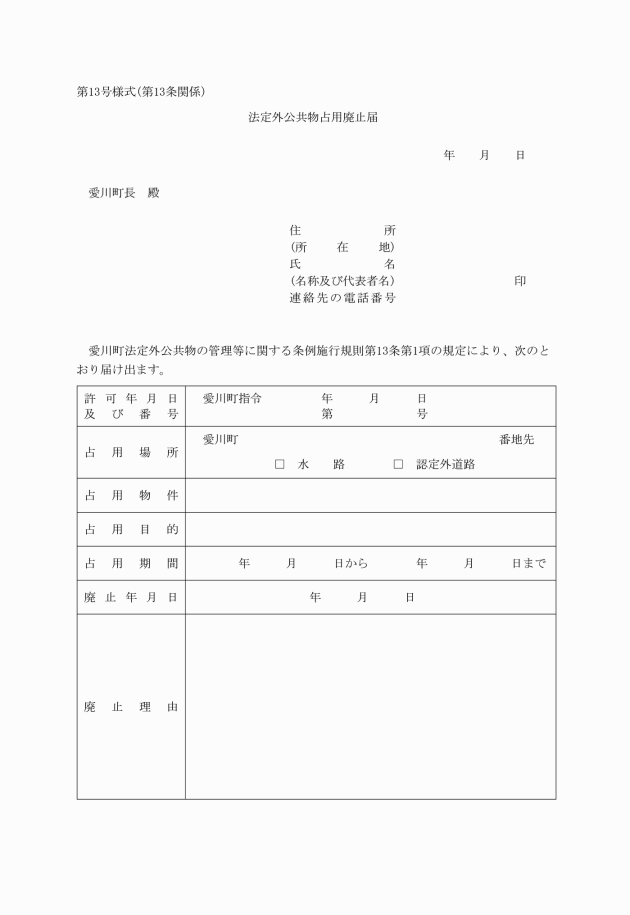 第8条 占用者等は、住所、氏名及び商号の変更したときは、速やかに法定外公共物占用者等住所等変更届(第7号様式)を町長に提出しなければならない。