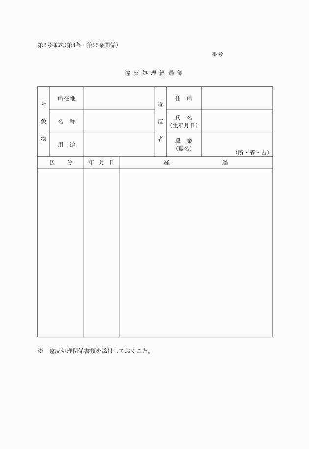 第25条 消防長は、違反処理を行った場合は、当該違反が是正又は完結するまでの経過を違反処理経過簿に記載し、整理しておくものとする。