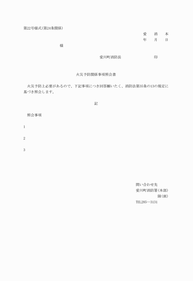 2 前項により指示書を交付した場合は、愛川町火災予防査察要綱(昭和62年8月1日施行)第20条第2項に規定する改善結果(計画)報告書により、是正についての計画等を報告させるものとする。