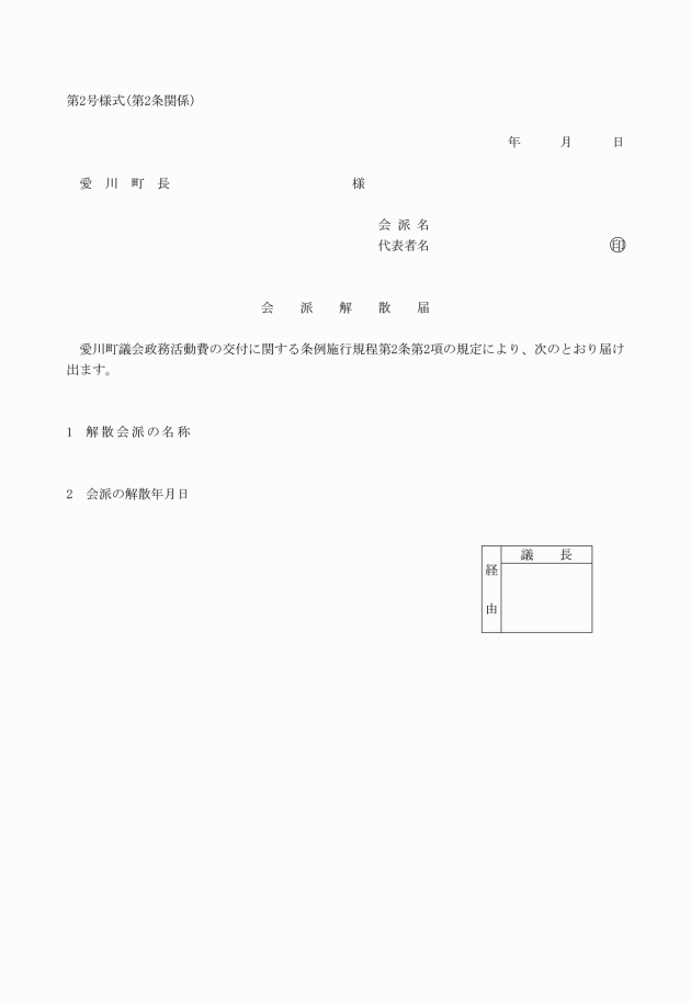 第2条 議員が会派を結成し、会派に係る政務活動費の交付を受けようとするときは、当該会派の代表者は、速やかに会派結成(変更)届出書(第1号様式)を議長を経由して町長に提出しなければならない。当該届出事項に変更が生じたときも同様とする。