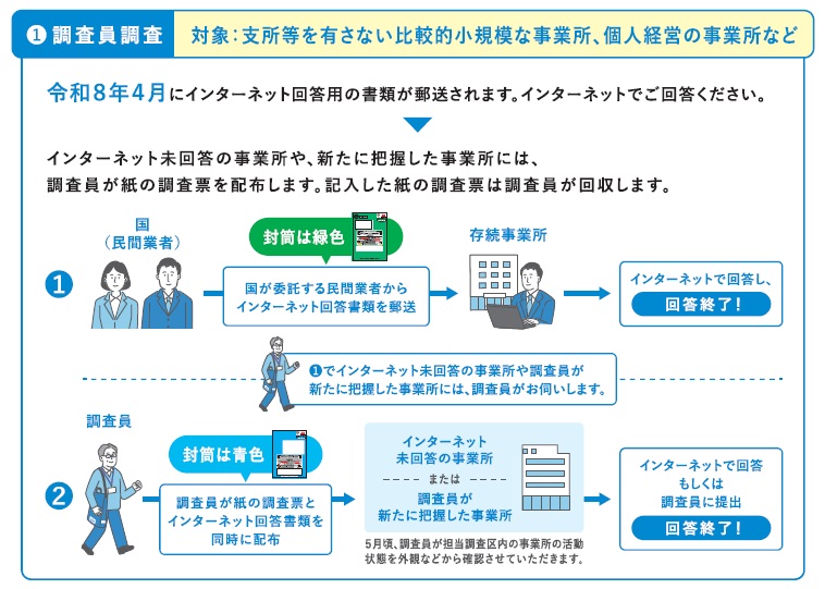 ※インターネットでご回答いただいた場合でも、調査員が担当区域内を巡回し、事業所の外観などから現在のご様子を確認させていただくことがあります。