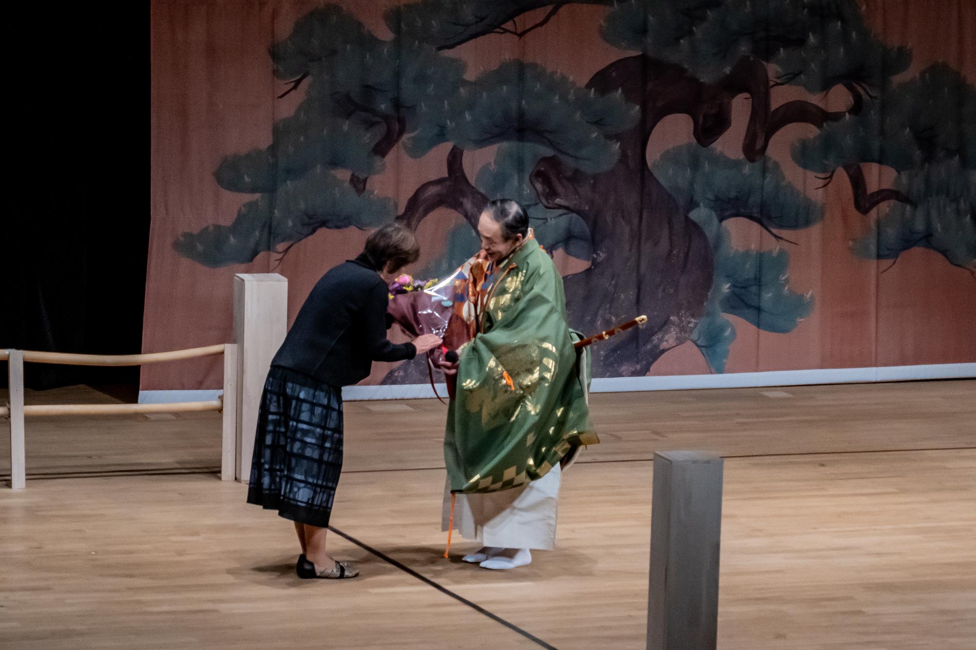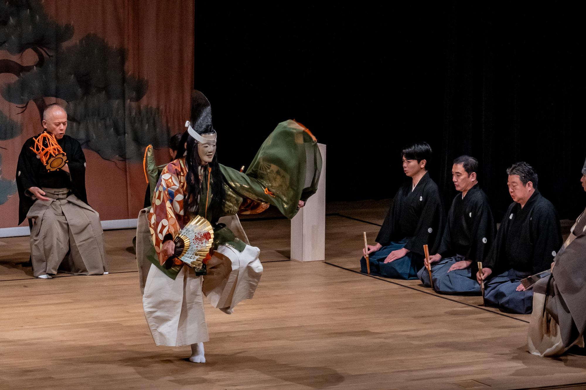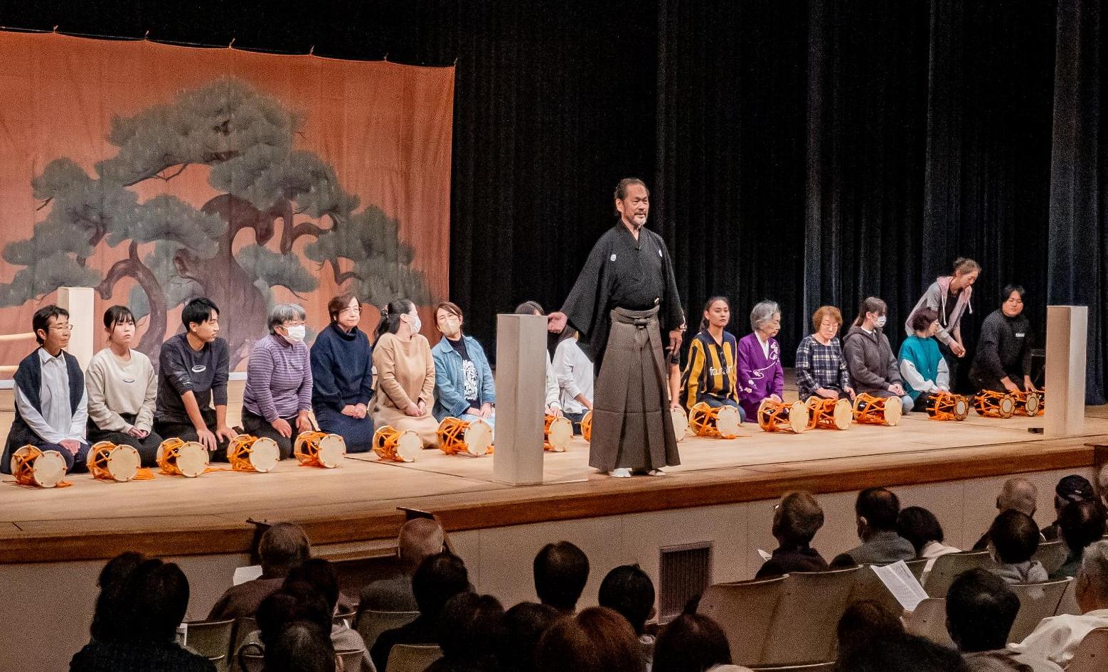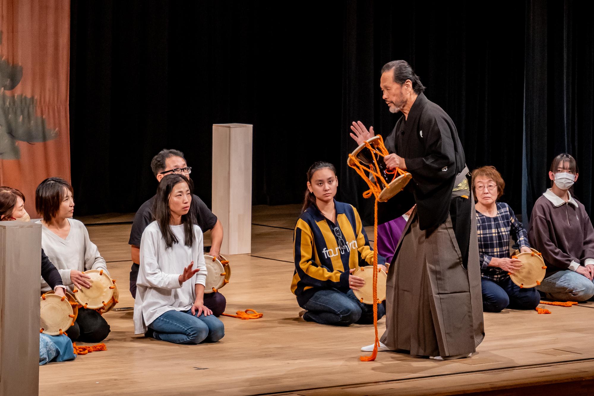 大倉流大鼓方(おおくらりゅうおおつづみかた)大倉 正之助先生による「ワークショップ 大鼓体験」では、観客から17名が壇上にあがり、大倉先生の指導のもと大鼓の叩き方を教わっていました。 最後には、観世流能楽師 梅若 志長(うめわか ゆきなが)先生と観客が一緒に「高砂」を謡い、大倉先生と壇上の観客が謡にあわせて大鼓を叩きました。 能公演「経正」