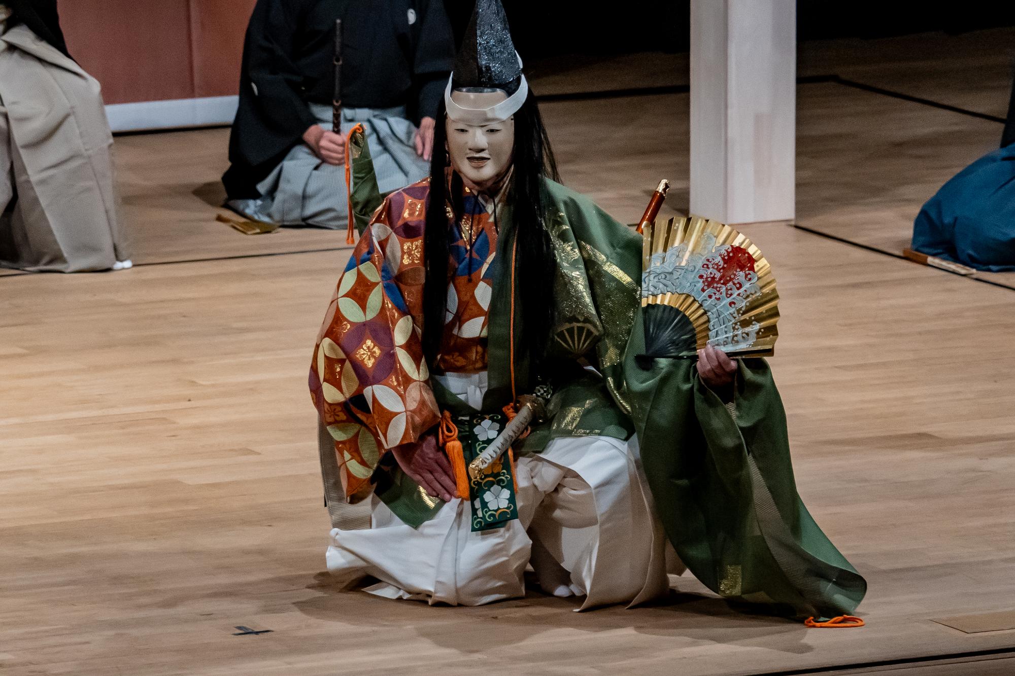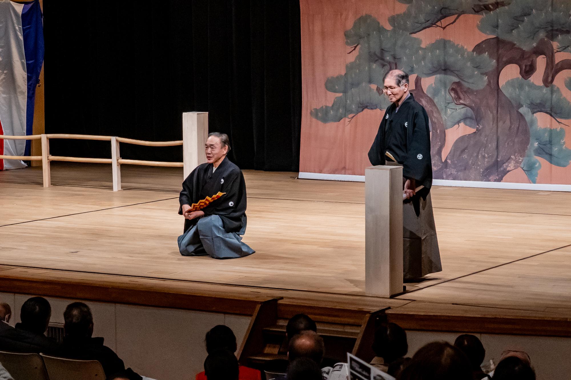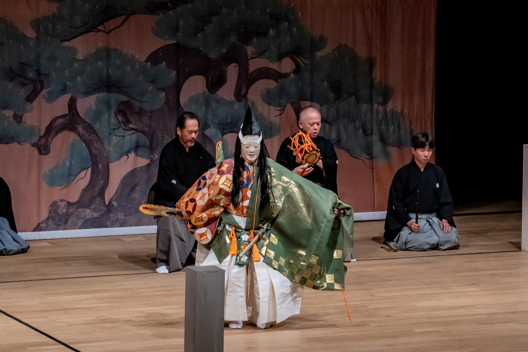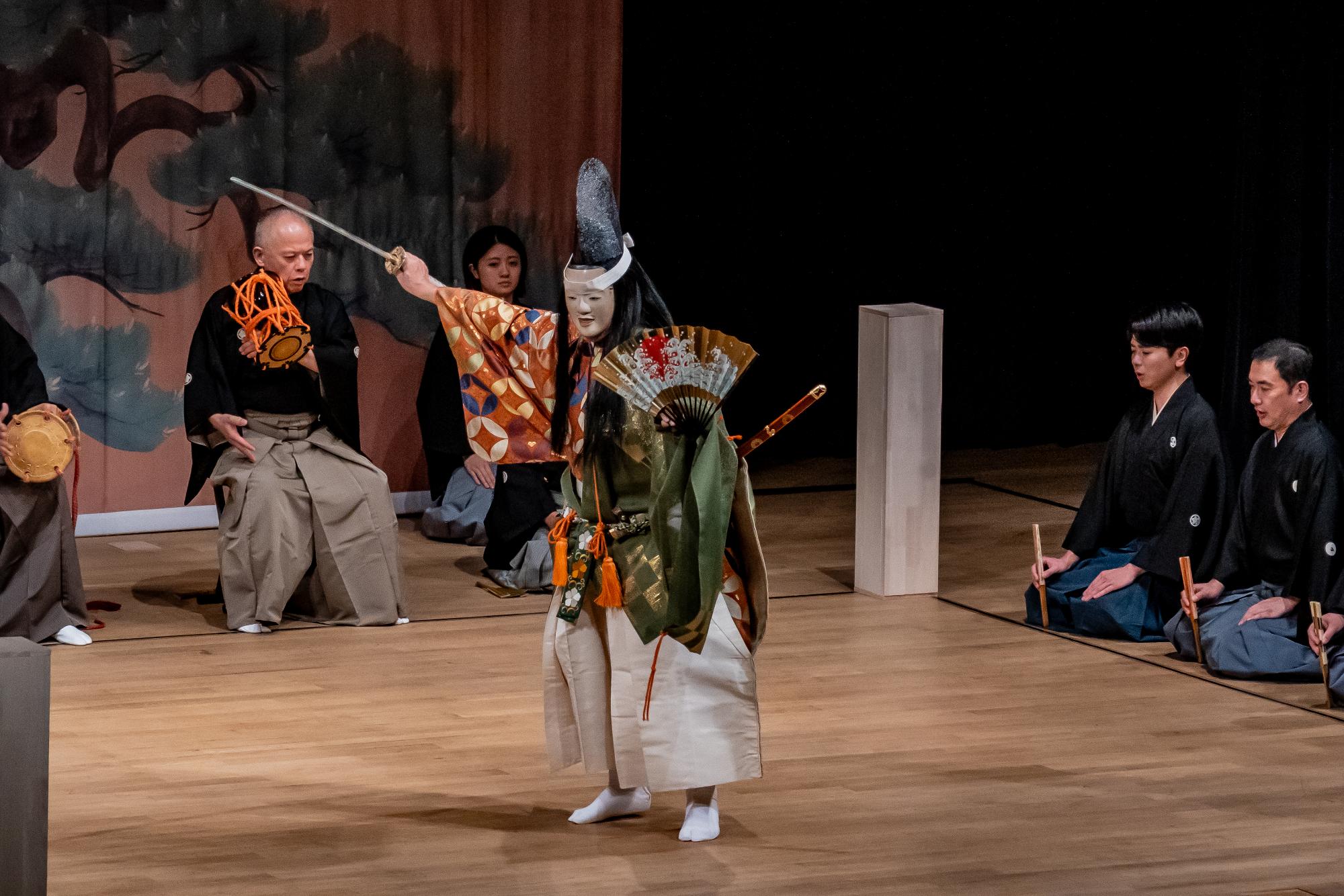 大倉流大鼓方(おおくらりゅうおおつづみかた)大倉 正之助先生による「ワークショップ 大鼓体験」では、観客から17名が壇上にあがり、大倉先生の指導のもと大鼓の叩き方を教わっていました。 最後には、観世流能楽師 梅若 志長(うめわか ゆきなが)先生と観客が一緒に「高砂」を謡い、大倉先生と壇上の観客が謡にあわせて大鼓を叩きました。 能公演「経正」