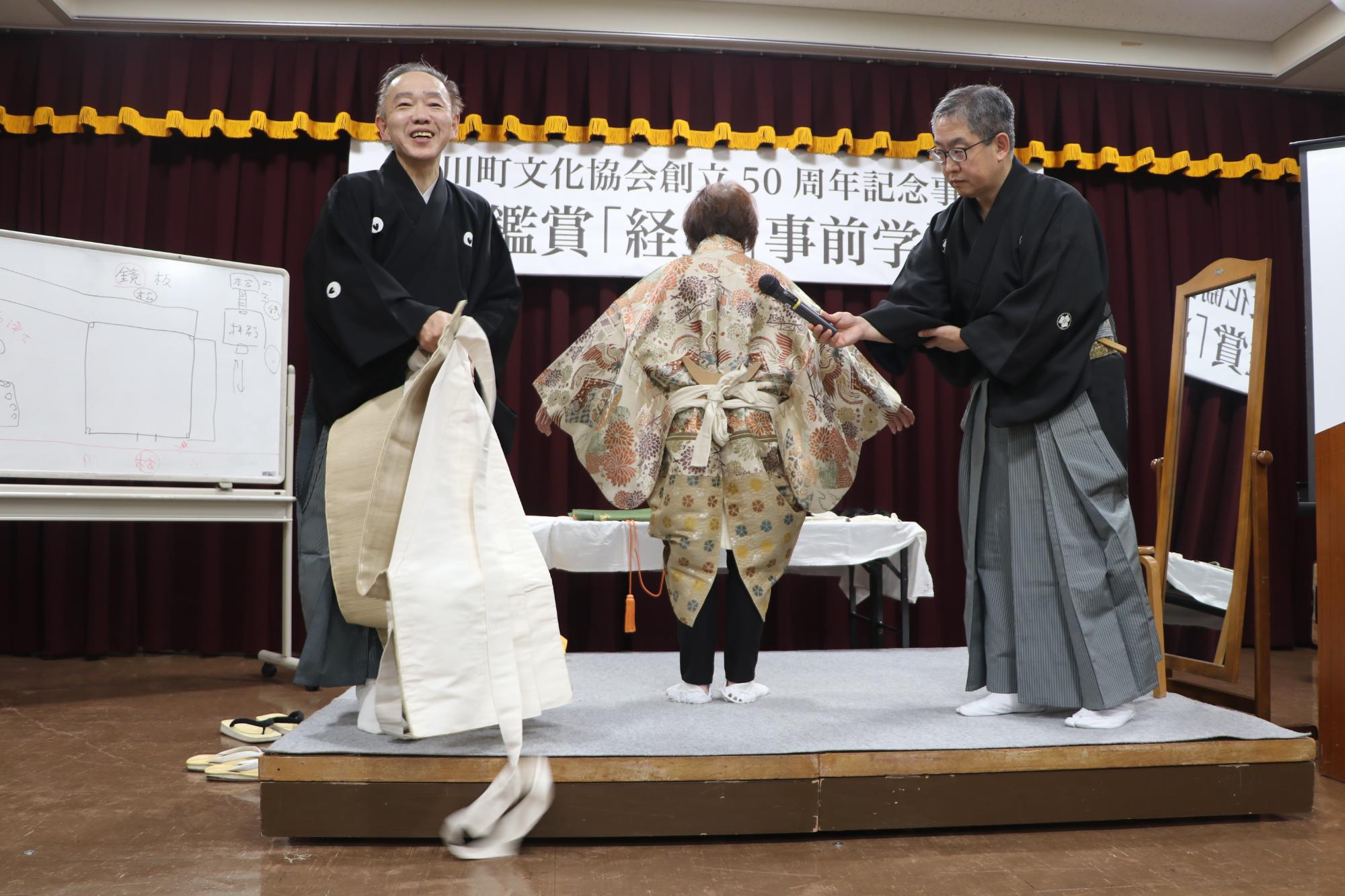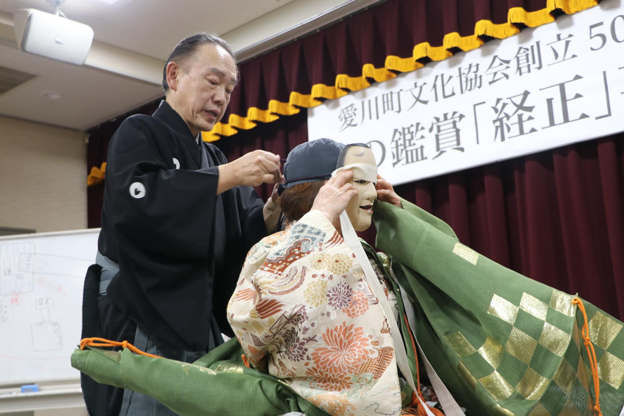 加藤先生をはじめとする出演者皆様の演技や演奏に観客の皆様は舞台に見入っていました。 上演終了後には、文化協会より、感謝の気持ちを込めて、加藤先生に花束をお渡しさせていただきました。 観客の感想・初めての鑑賞だったが、思っていた以上に楽しめた。貴重な経験をありがとうございます。 事前学習会を開催しました!10月18日(土曜日)に加藤先生にお越しいただき、25日(土曜日)の講演会に先立ち、事前学習会を開催しました。 当日は70名の参加者が加藤眞悟先生のお話に耳を傾けていました。 また、参加者が能面をつける貴重な体験もありました! 熱心に話を聞く参加者 能装束の着付け体験 能面をつける参加者 余剰分チケット販売10月6日(月曜日)より、愛川町役場3階教育委員会スポーツ・文化振興課窓口にて余剰分チケット販売を行っております。観覧希望人数分の料金(1枚500円)をご持参の上、お越しください。 ※一般販売は先着順となりまして、規定枚数に達した場合は販売終了いたします。 愛川町文化協会創立50周年記念講演会開催愛川町文化協会は、今年創立50周年を迎えるにあたり、記念講演会「能の鑑賞『経正(つねまさ)』を開催します。 観世流能楽師・加藤 眞悟(かとう・しんご)さんを講師に迎え、能楽についての講演や大鼓体験・「高砂や」を謡うワークショップが行われるほか、能「経正」が上演されます。 加藤 眞悟(かとう・しんご)さん昭和33年(1958年)生。平塚市出身、横浜市在住。学生時代に能に出会いプロを志す。故二世梅若万三郎及び現万三郎に師事。観世流準職分。重要無形文化財(能楽)総合認定保持者。 平成11年(1999年)より毎年自主公演『明之會』を開催する。主な披曲『木賊』『鷺』『卒都婆小町』『三輪 白式神神楽』『恋重荷』『安宅』『望月』『砧 』『道成寺 赤頭』『石橋』『猩々乱』等。 また新しい事にも取り組み、平塚ゆかりの古能『真田』(源平盛衰記)『伏木曽我』『虎送』『和田酒盛』『大磯』(曽我物語)、尾張の古能 『不逢森(あわでのもり)』『熱田龍神』 の復曲 、新作能 『将門』『新皇将門』 『射留魔川(いるまがわ)』『長崎の郵便配達』 の制作に関わり初演のシテを勤める。 平塚市、伊勢崎市、横浜では定期的に能楽の普及公演にも取り組み、各地での能楽公演に関わる。また、平成27年には愛川町文化協会創立40周年記念講演会として「能の鑑賞『羽衣』」を愛川町文化会館ホールで上演した。 眞謡会を主宰し愛好者へ謡仕舞の指導にあたる。(公財)梅若研能会理事 。(一社)復曲能を観る会代表理事 。(一社)明之會代表理事。(公社)能楽協会東京支部著作権関連委員。「よこはま能の会」「いせさき能」「湘南ひらつか能狂言」実行委員会顧問。 愛川町文化協会創立40周年記念講演会「能の鑑賞『羽衣』」(平成27年開催)の様子