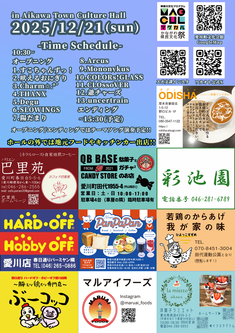 出演順決定!当日の出演順が決定いたしました! 下記のバンド紹介ぺージを出演順に変更いたしまして、各バンドからの熱いメッセージも公開しておりますので、是非ご覧ください! 周知チラシ完成!今回のチラシは、愛川高校の「片野 由梨花」さん(Arcus)にイラスト・デザインを担当いただきました! 表面 裏面 裏面には、協賛をいただきました、ODISHA様、カフェド巴里苑様、QB BASE CANDY STORE様、彩池園様、ハードオフ・ホビーオフ愛川店様、自家製パン工房PanPaPan様、ひよっこすずめ様、ぶーコッコ様、マルアイフーズ様、洋菓子ラミエット様の広告を掲載しています! 協賛いただきました10社の皆様誠にありがとうございました! テーマソングコンテスト受付終了!