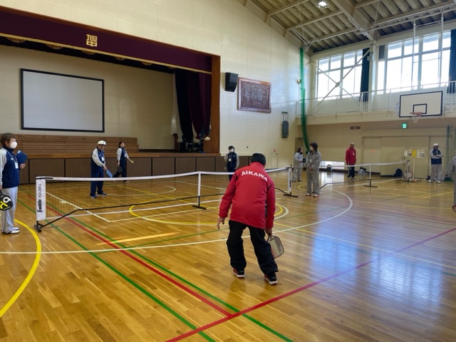 研修内容は、ラジオ体操から始まり、ピックルボールとモルックの2種目を行いました。